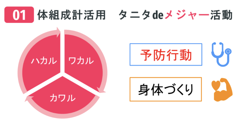今年で4年目になるメジャー活動では体組成計を全社員に配布、アプリを利用した任意活用の施策です。測定の「measure」を通して、一流の「major」になろうという思いが込められています。