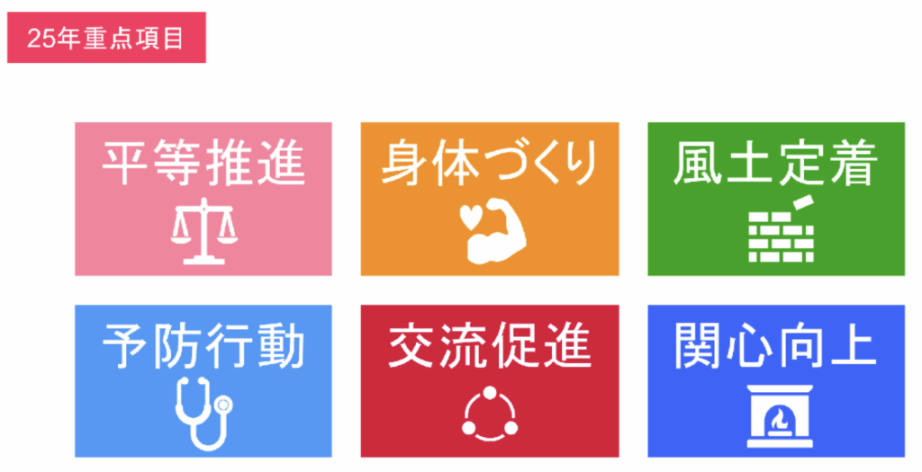 そして、これらを効果的に企画・実行できるように2025年度は以下のような健康経営の数値目標を定め、当該重点項目をバランスよく取り入れた具体的な取り組みを行っています。