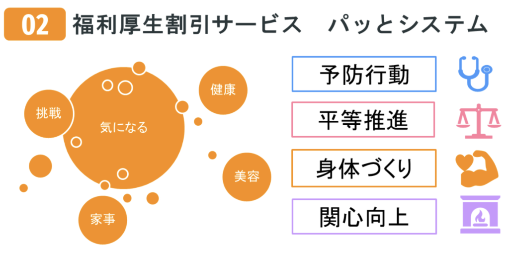 従業員個人が、心身の健康のために利用したい気になるサービスをお得に受けられる福利厚生システム(福利ぱっと)を導入しています。